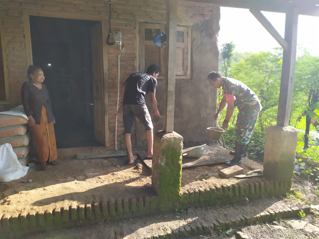 Rumah Mbah Wagimah yang saat ini sedang di rehab dengan plesteran dinding yang sedang di kerjakan oleh Anggota Satgas TMMD, kami mencoba untuk konfirmasi dengan beliau tentang rumahnya yang dapat bantuan untuk di rehab. Mbah Wagimah mengatakan”Matur nuwun sanget sampun direwangi pak tentara, griyane kulo sakniki sampun sae ( terima kasih sekali, di bantu Pak Tentara rumah saya sekarang sudah bagus),”Kata Mbah Wagimah yang polos.