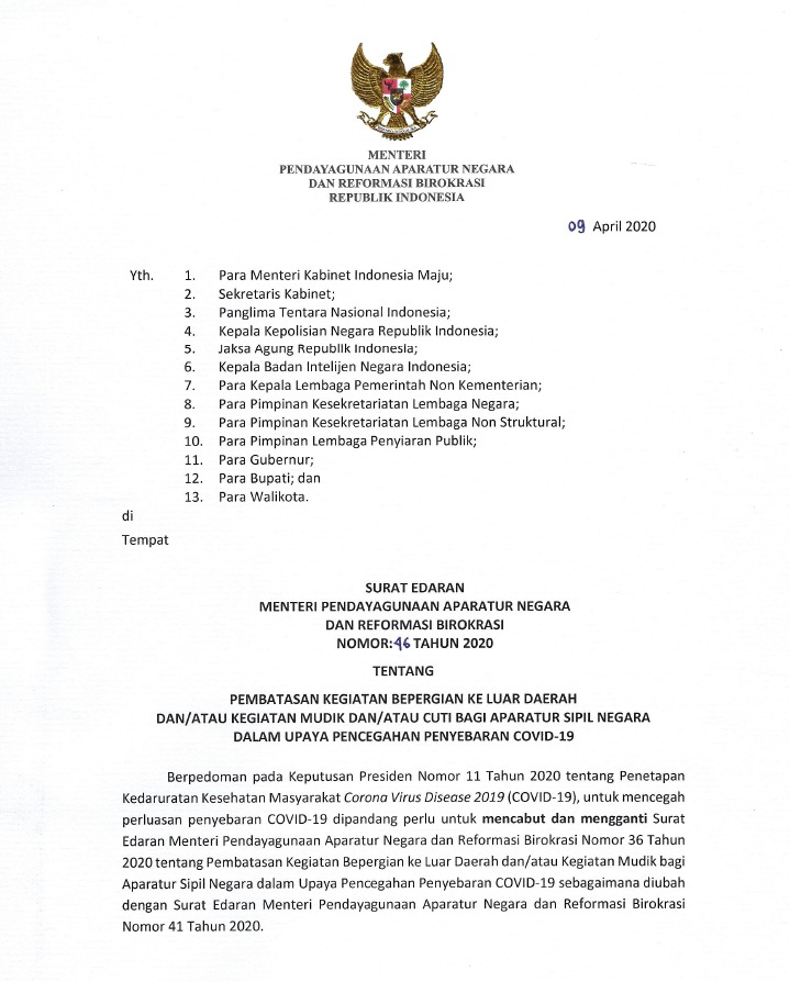 Larangan tersebut tercantum dalam Surat Edaran Menteri PANRB No. 46/2020 tentang Pembatasan Kegiatan Bepergian Ke Luar Daerah dan/atau Kegiatan Mudik dan/atau Cuti Bagi ASN dalam Upaya Pencegahan Covid-19. SE ini mengganti dan mencabut SE No. 36 dan No. 41 Tahun 2020.