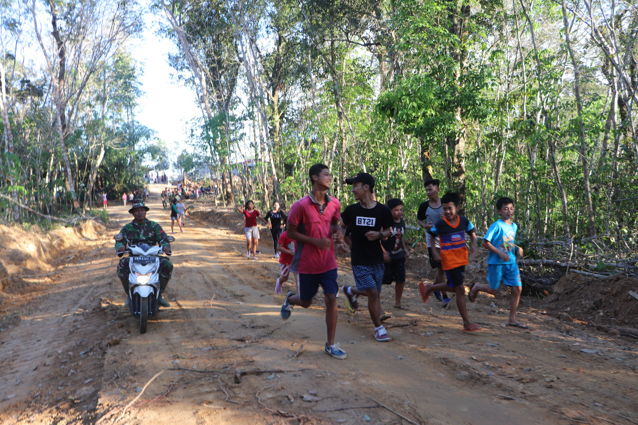 Suaraindo.id –Satgas TMMD Regtas 107 Kodim 1204/Sanggau, Serda Bunyamin dan Praka Juli Ismanto yang dalam kesehariannya melaksanakan kegiatan penyelesaian dilokasi yang menjadi sasaran TMMD, selesai bekerja menjelang sore mengajak anak anak untuk melaksanakan lari sore atau joging di Dusun Jonti, Desa Sei Batu, Kecamatan Kapuas, Kabupaten Sanggau, Senin (6/04/2020).