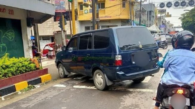 Dalam potret tersebut, terlihat sebuah mobil MPV berwarna biru gelap tengah terparkir di pinggir jalan dengan posisi yang membuat heran.