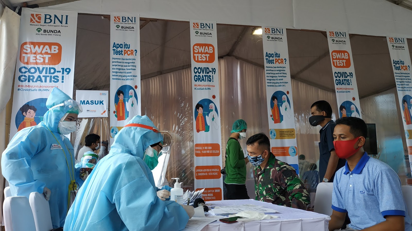 Suaraindo.id-Bank Negara Indonesia (BNI) berikan test swab gratis kepada profesi garda terdepan seperti TNI/ Polri dan Tenaga Medis di Provinsi Sumatera Barat di lapangan Ajenrem 032/ Wbr (31/5/2020.