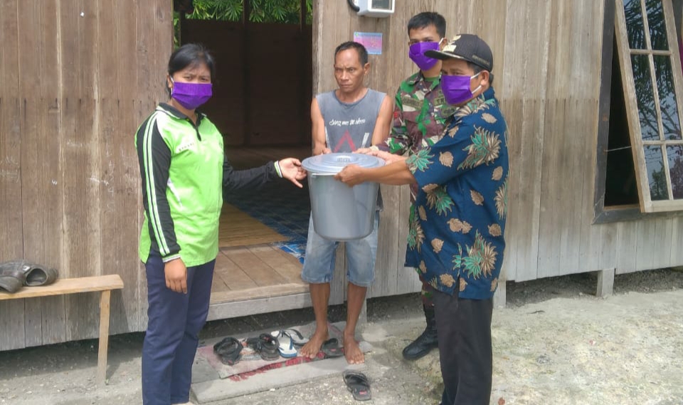 Pembagian ember untuk cuci tangan dibagikan Praka Peronimus bersama dengan aparat pemerintah Desa Wungkur Baru.