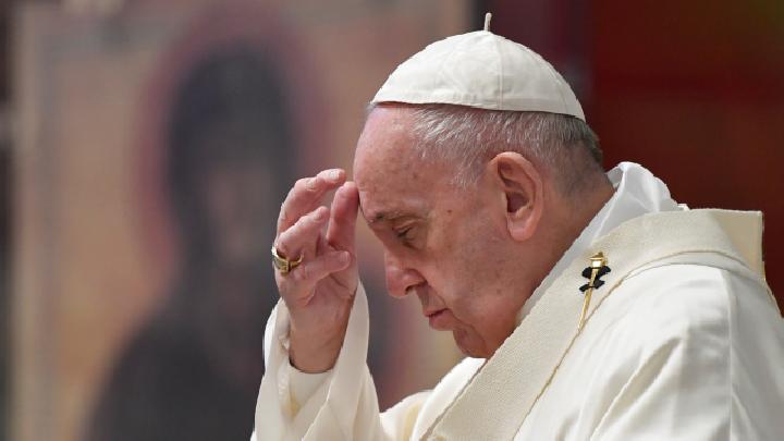 | Paus Fransiskus saat memimpin acara Kamis Putih di tengah pandemik virus corona atau Covid-19 di St. Peter’s Basilica di Vatikan, 9 April 2020. (Teras.id) |