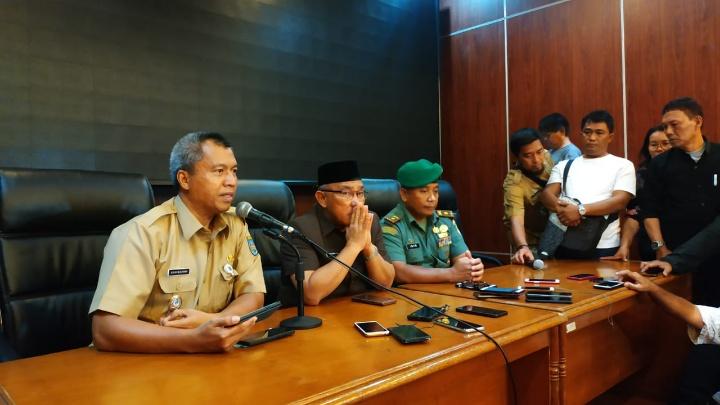 | Wali Kota Depok, Mohammad Idris (kedua kiri) saat konferensi pers terkait warganya positif virus corona atau COVID-19, di Balai Kota Depok, Senin 2 Maret 2020. (Teras.id) |