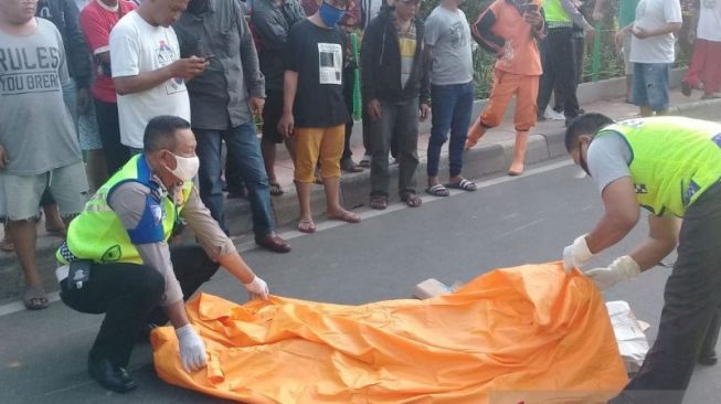 | Polisi menutup jenazah wanita tanpa identitas yang tewas tertabrak sepeda motor di Jalan Tubagus Angke, Tambora, Jakarta, Minggu (10/5/2020). (Suara.com) |