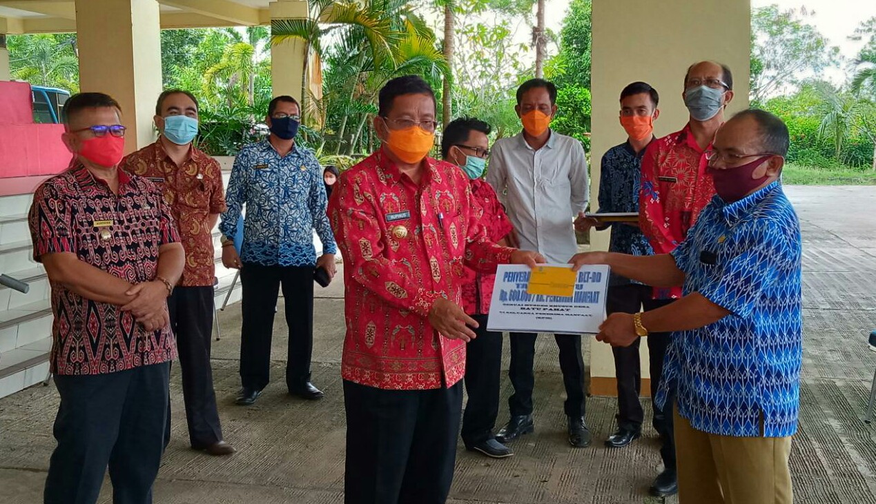Suaraindo.id – Bupati Sekadau Rupinus menyerahkan secara simbolis Bantuan Langsung Tunai (BLT) Dana Desa untuk dua desa di loby kantor Bupati Sekadau pada Jumat (5/6/2020) pagi.