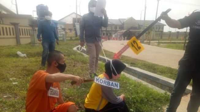 | Tersangka AS (28) memeragakan adegan penusukan yang dilakukan kepada istrinya dalam rekonstruksi di halaman Mapolres Serang, Banten, Jumat (5/6/2020)(Teras.id) |