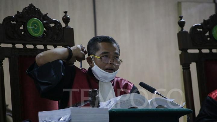 | Hakim Ketua saat memimpin sidang lanjutan kasus penyiraman air keras terhadap Novel Baswedan di Pengadilan Negeri Jakarta Utara, Selasa, 12 Mei 2020.(Teras.id) |
