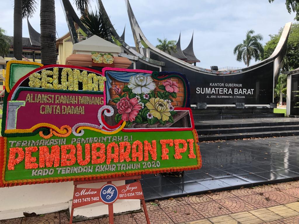 Papan bunga ucapan selamat itu mengatasnamakan dari Aliansi Ranah Minang Cinta Damai. Dalam papan bunga itu ditulisnya bahwa pembubaran FPI adalah kado terindah di akhir tahun 2020.