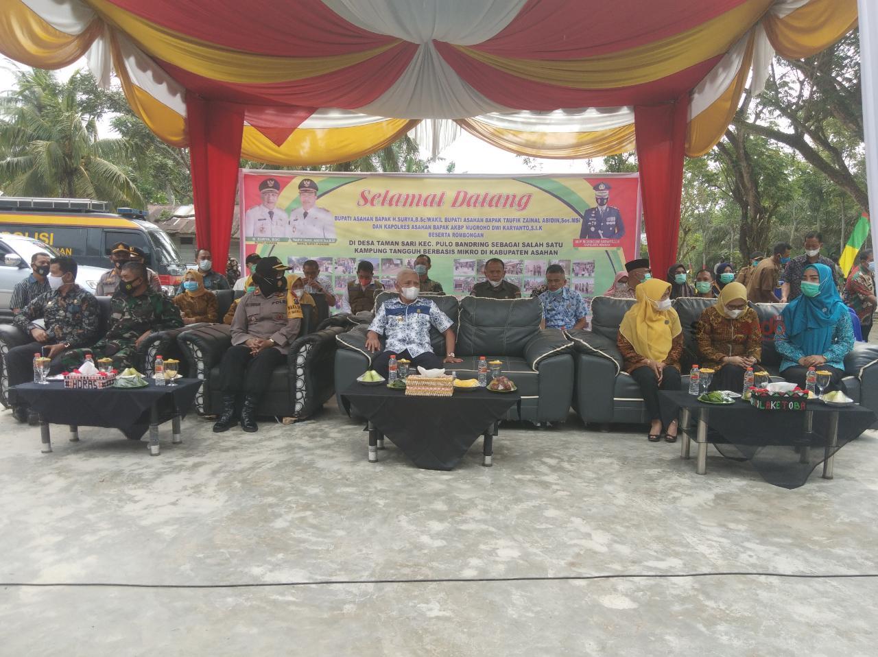 Suaraindo.id- Bupati Asahan bersama Kapolres Asahan, Wakapolres Asahan Kompol Sri Juliani, Dandim 0208 (Mewakili), Ketua TP PKK Kabupaten Asahan Titiek Sugiharti Surya, OPD terkait, Camat Pulo Bandring Jutawan Sinaga dan Kades Taman Sari Desa Taman Sari Kecamatan Pulo Bandring Menjadi Kampung Tangguh Berbasis Mikro.