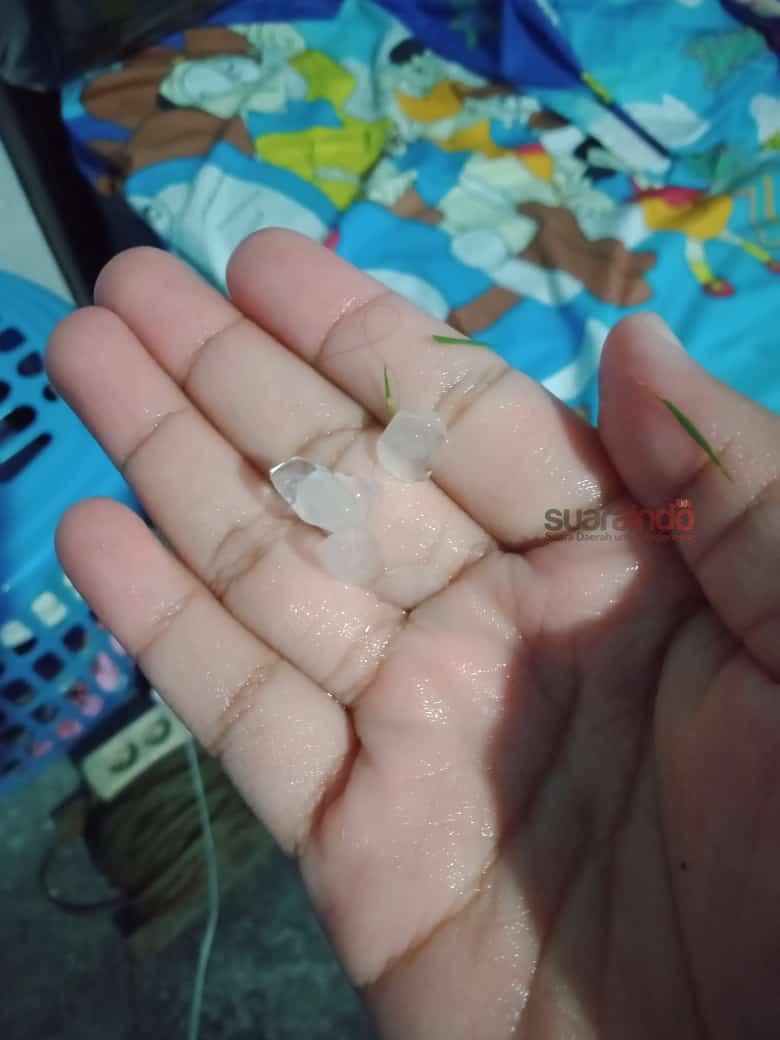 “Hujan deras disertai angin kencang mas jam setengah enam sore tiba tiba terdengar suara keras diatap seperti dilempar batu, saya keluar rumah dan melihat bongkahan es sebesar biji jagung,” kata Dwi.