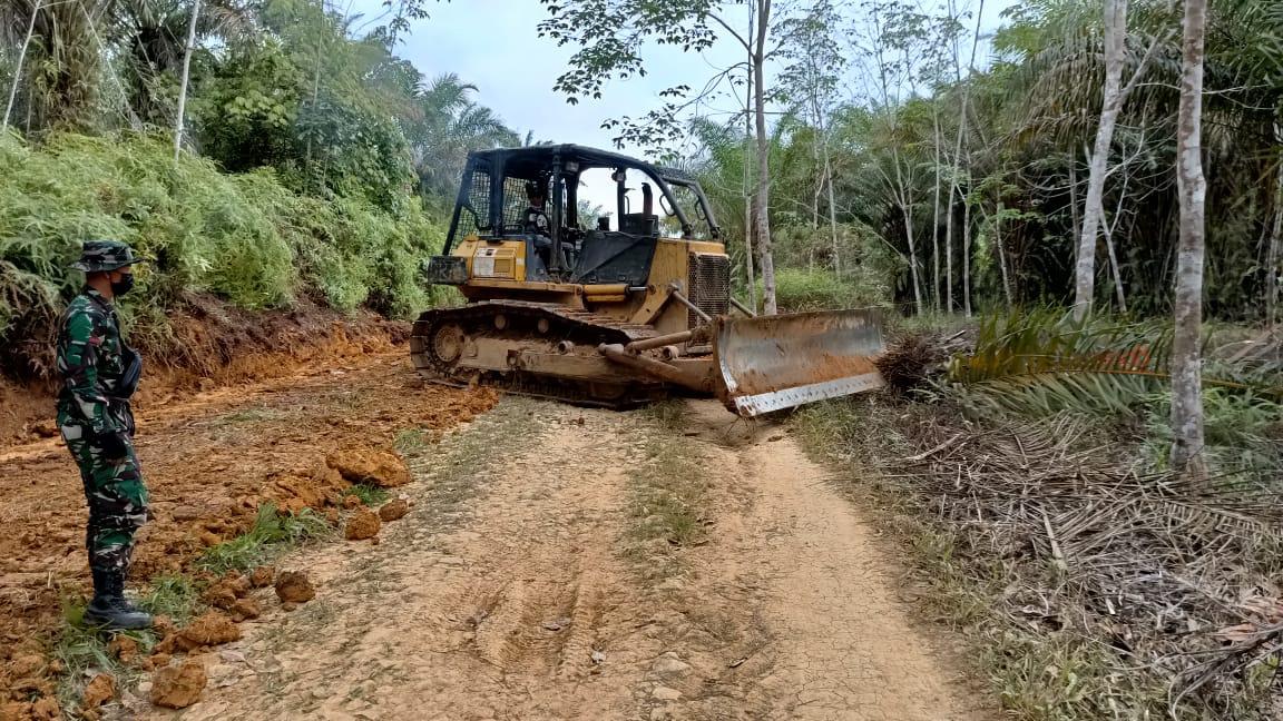 Pembersihan lokasi jalan sasaran fisik TMMD Reguler ke-110 Kodim 1201 dikerjakan TNI bergotong royong dengan masyarakat setempat.