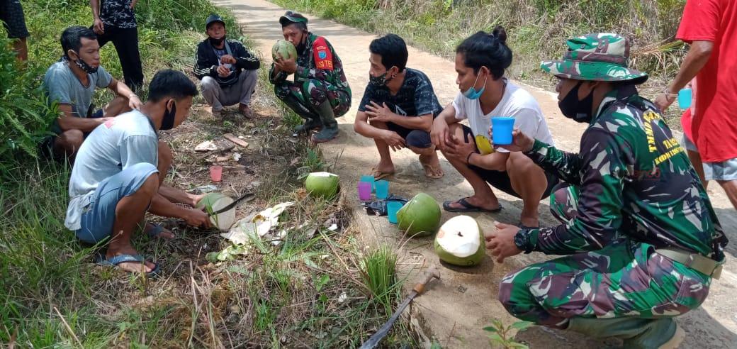 Warga dan TNI terlihat kompak dan akrab saat sedang istirahat di pinggir ruas jalan yang merupakan sasaran TMMD, sambil menikmati air kelapa muda yang di sediakan masyarakat.
