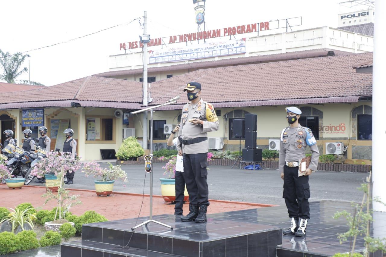 Suaraindo.id—Kapolres Asahan AKBP Nugroho Dwi Karyanto mepimpin apel gelar pasukan Operasi Keselamatan Toba 2021 Polres Asahan di Halaman Polres Asahan, Senin (12/4/2021).
