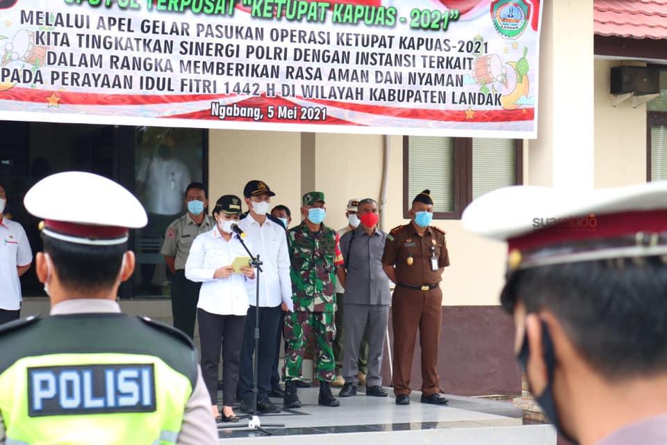 Bupati Karolin menjelaskan apel gelar pasukan operasi ketupat tahun 2021 dalam rangka pengamanan Hari Raya Idul Fitri 1442 Hijriah serta membantu pemerintah dalam menerapkan larangan mudik lebaran.