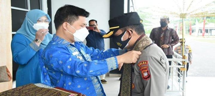 Suaraindo.id – Dengan penerapan Protokol Kesehatan (Prokes) Covid-19. Bupati Sambas H. Satono dan Wakil Bupati Sambas Fahrur Rofi beserta jajaran Forkopimda menghadiri kegiatan acara pisah sambut Kepala Kepolisian Resort Sambas di Aula Kantor Bupati Sambas, pada Jumat (6/8/2021).