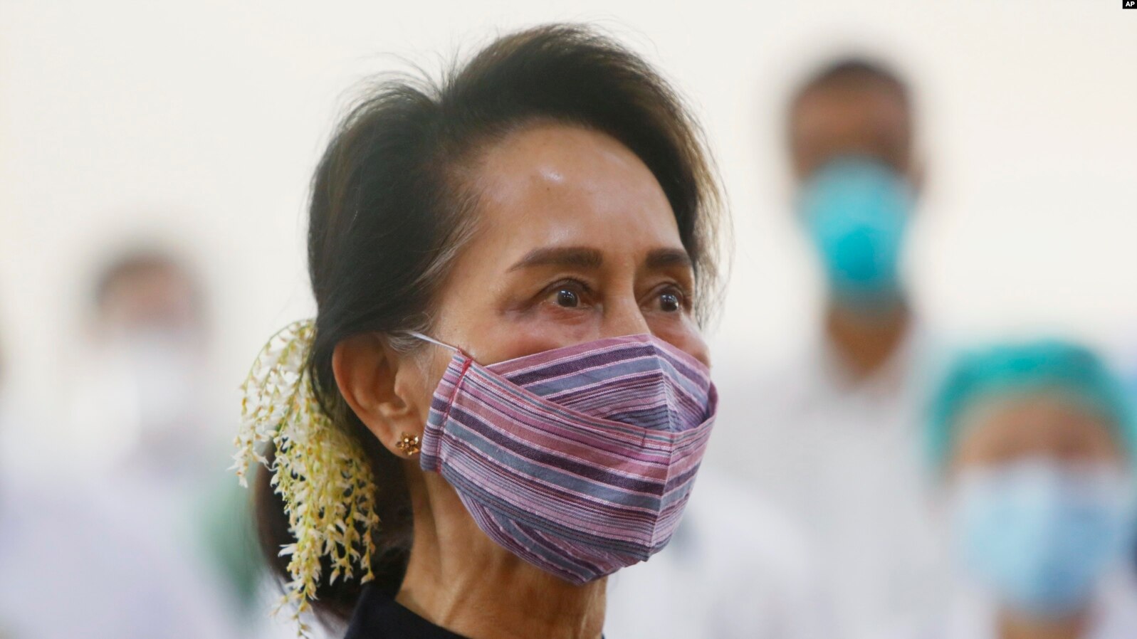 Aung San Suu Kyi saat menghadiri pelaksanaan vaksinasi untuk petugas medis di Naypitaw, Myanmar, 27 Januari 2021. (AP Photo/Aung Shine Oo, File)