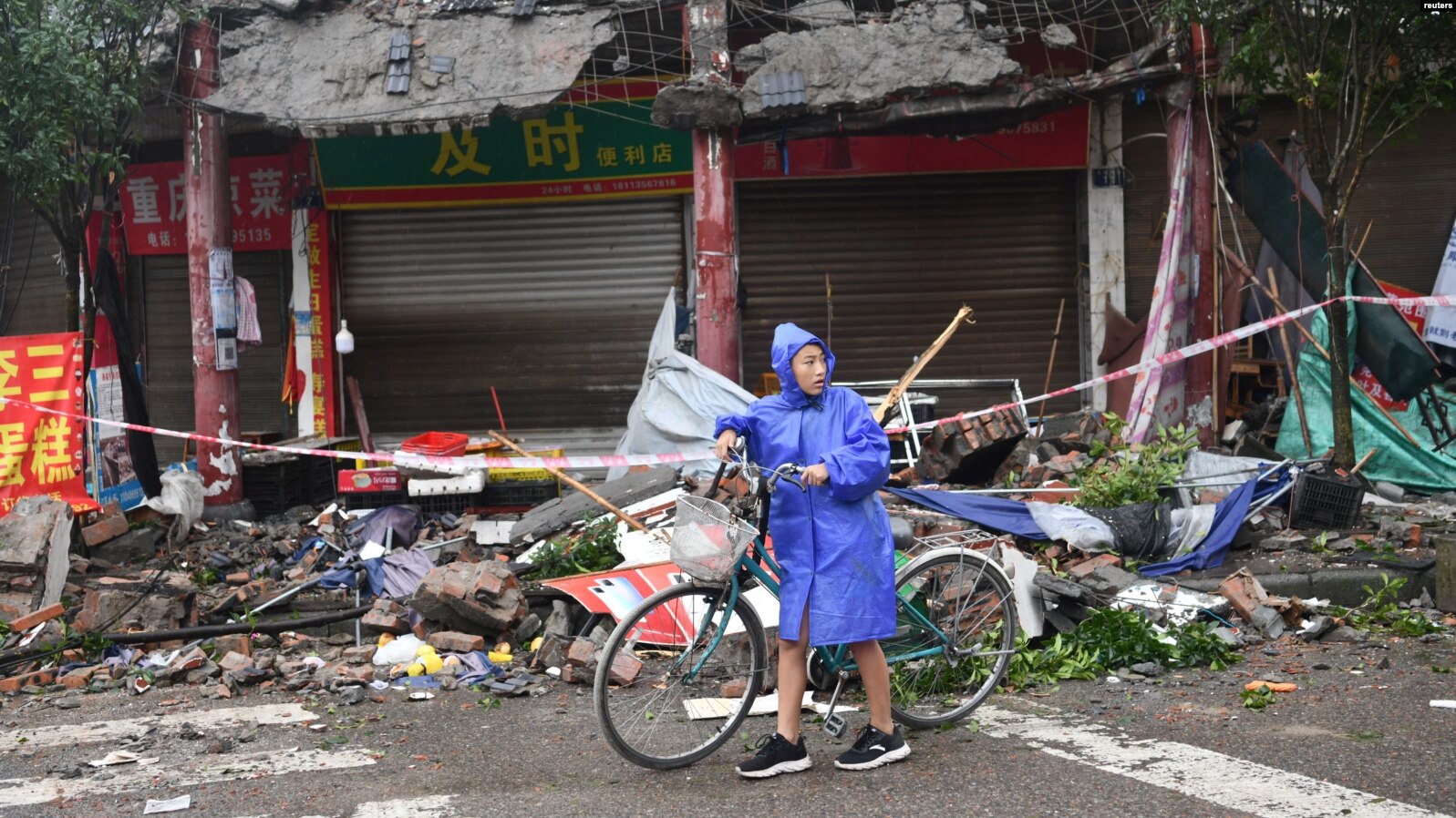 Seorang warga membawa sepedanya di antara rumah yang rusak akibat gempa di Luzhou, provinsi Sichuan, China, Kamis 16 September 2021.