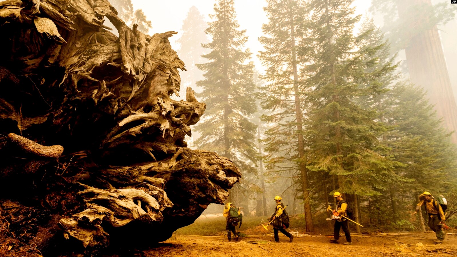Petugas pemadam kebakaran dengan selang dan helikopter pengangkut air bekerja untuk membatasi kerusakan pada pohon-pohon sequoia raksasa di hutan itu, di mana juga tumbuh jenis-jenis pohon lainnya.