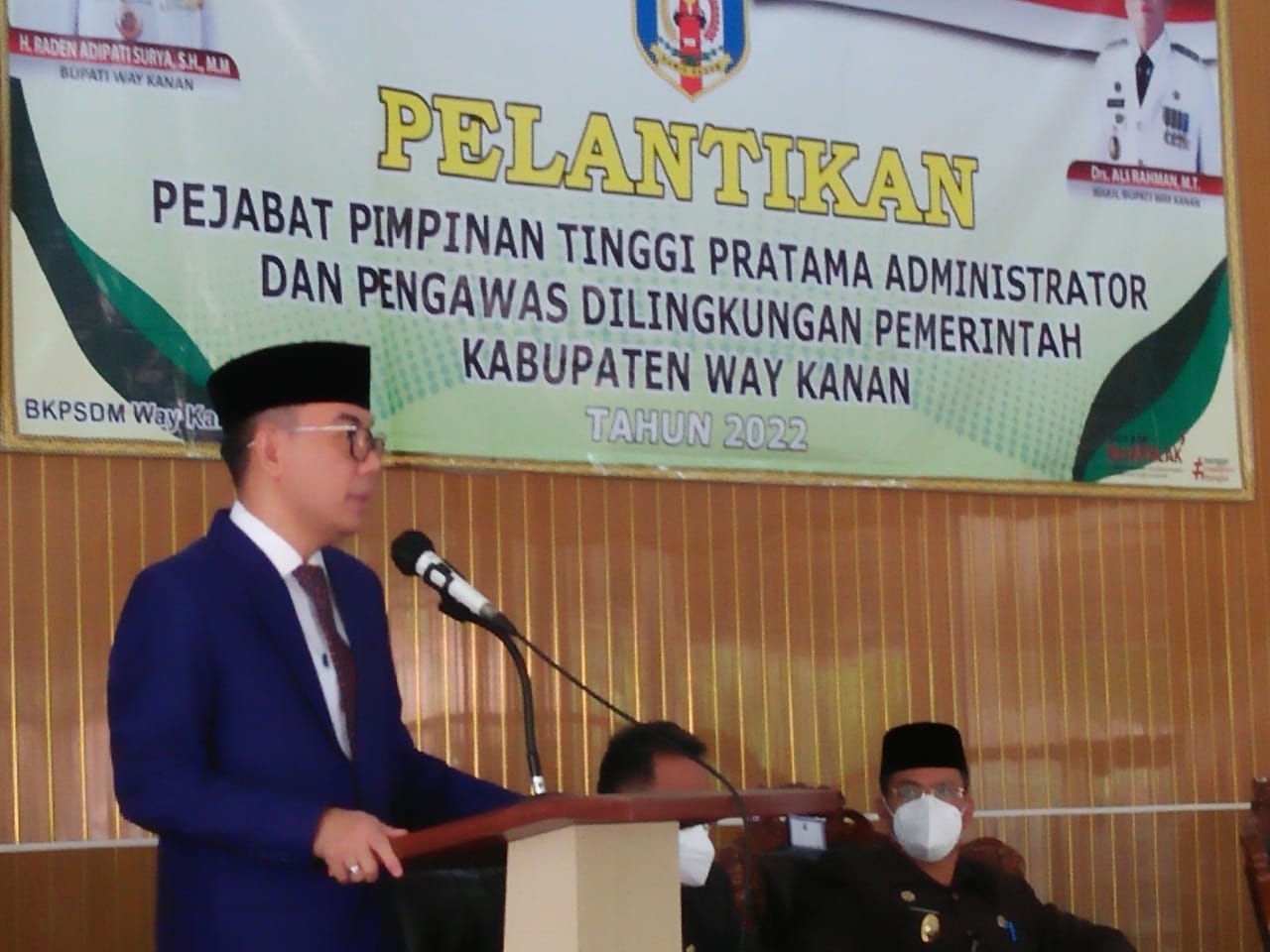 Acara pelantikan dan pengambilan sumpah Jabatan Fungsional di Lingkungan Pemerintah Kabupaten Way Kanan Tahun 2022 dihadiri oleh Staf Ahli bidang PHP, Assisten, Kadis Kominfo dan Kepala BKPSDM.