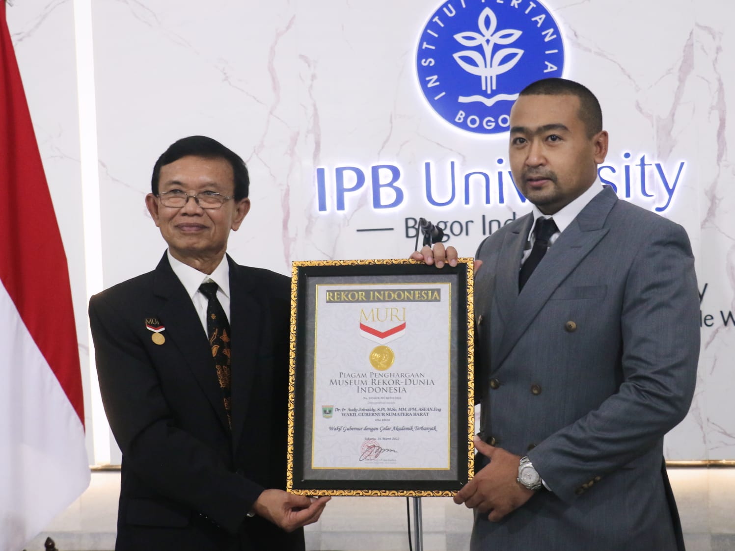 Prosesi penyerahan brevet dilaksanakan di Gedung Hakim Andi Nasution Komplek Kampus Institut Pertanian Bogor (IPB) Dramaga Bogor, Rabu (16/3). Dr. Ir. Audy Joinaldy, S.Pt., M.Sc., M.M., I.P.M., ASEAN, Eng., Dt. Rajo Pasisia Alam. Demikian panjangnya gelar akademik Wakil Gubernur usai diwisuda dan meraih Rekor Muri itu.