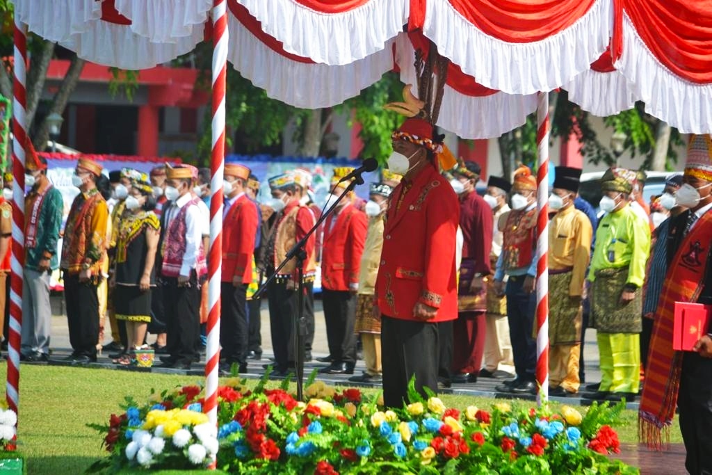 Suaraindo.id—Puncak peringatan hari jadi Kota Sanggau ke-406 Tahun 2022, ditandai dengan Upacara di Halaman Kantor Bupati dengan pembina upacara Bupati Sanggau Paolus Hadi di halaman Kantor Bupati, Senin (4/4/2022). Tampak peserta upacara mengenakan pakain adat nusantara.