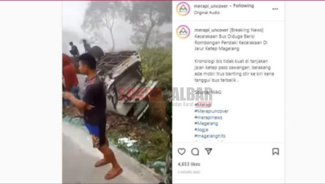 “Kecelakaan Bus diduga berisi rombongan pendaki kecelakaan di Jalur Ketep Magelang,” tulis akun tersebut dikutip Sabtu.