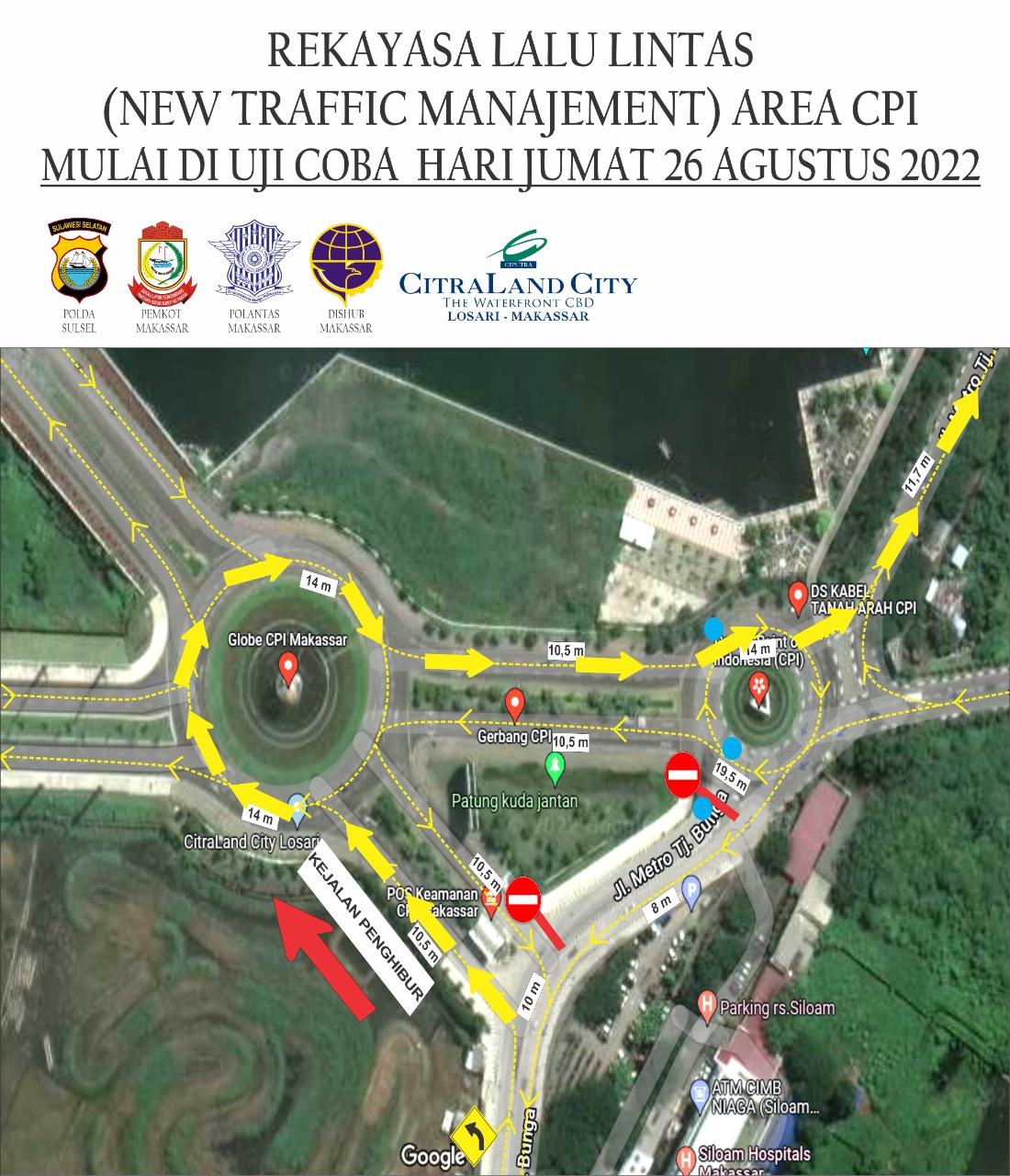 Terlepas dari pro dan kotra tentu saja harus menjadi pemakluman bersama demi kelancaran berlalulintas. Upaya ini tidak terlepas dari kerja keras dengan sinergisitas antar pemangku kepentingan baik TNI, Polri, Pemprov Sulsel, Pemko Makassar dan utamanya masyarakat Makassar serta kabupaten sekitarnya. Sebagai lanjutan akan dilakukan rekayasa lalin diseputaran kawasan CPI dan Jalan Metro Tanjung. Setelah melakukan analisa mendalam antara Dishub Kota Makassar, Satlantas Polrestabes Makassar, Dinas PU Kota Makassar dan Beberapa ahli transportasi direncanakan akan dilakukan uji coba perubahan arus lalin yang datang dari arah metro tanjung untuk masuk ke bundaran CPI seperti gambar dibawah ini.
