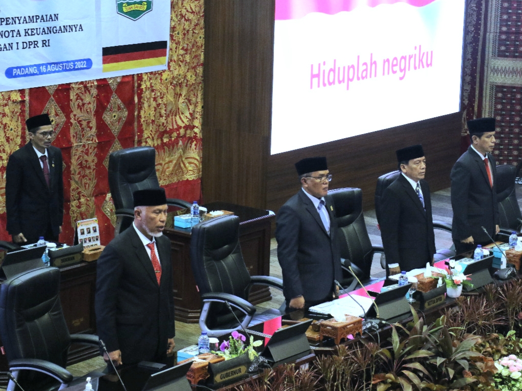 Suaraindo.id- Gubernur Sumatera Barat, Buya Mahyeldi, bersama Sekretaris Daerah dan jajaran OPD lingkup Pemerintah Provinsi Sumbar, mengikuti Rapat Paripurna DPRD Provinsi Sumatera Barat dalam rangka mendengarkan Pidato Presiden RI pada Sidang Tahunan MPR RI dan Sidang Bersama DPR RI dan DPD RI, di Ruang Rapat Paripurna DPRD Sumbar, Selasa (16/8/2022).