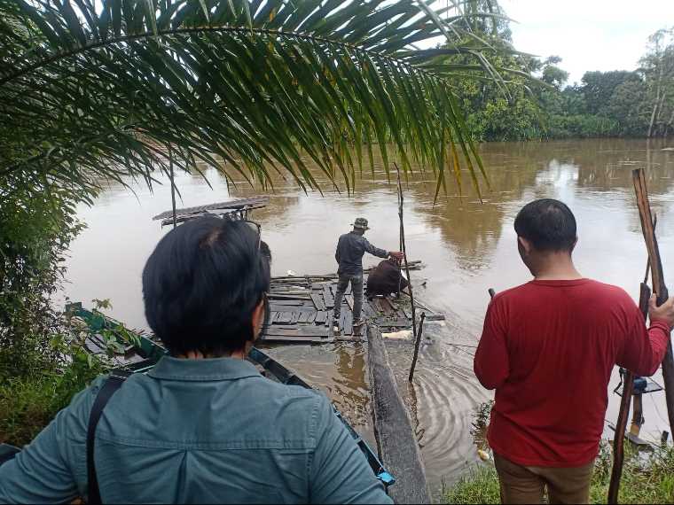 Saat melkukan pengecekan Sulastri juga mengatakan adanya bekas aliran air limbah dari kolam menuju sungai Batang Tebang dan adanya 1 unit Exsavator yang tumbang disekitaran kolam limbah tersebut
