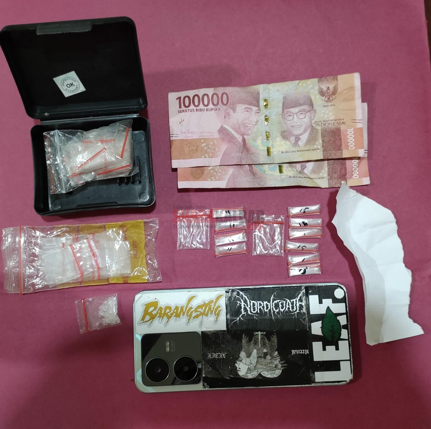 Satu buah plastik klip transparan berisi 4 buah plastik klip transparan berisi kristal diduga Narkotika jenis sabu yang dibalut dengan potongan kertas warna putih, 1 buah kotak warna hitam berisi 1 bungkus plastik transparan bekas dan ditemukan 1 buah tas merk kalibre berisikan uang sebanyak Rp 200 ribu.