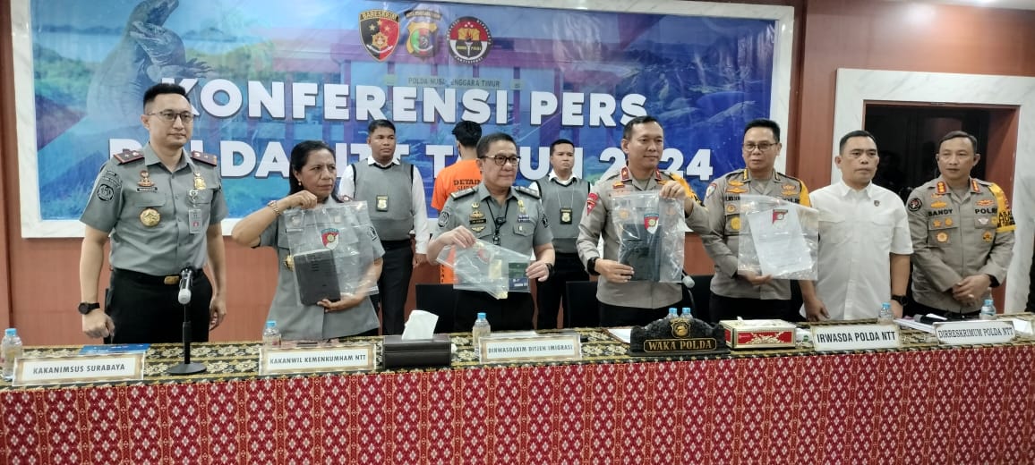 Acara jumpa pers dipimpin Wakapolda NTT Brigjen Pol. Awi Setiyono, didampingi Irwasda Polda NTT Kombes Pol. I Made Sunarta, Dirreskrimum Kombes Pol Patar Silalahi, dan Kabidhumas Polda NTT Kombes Pol. Ariasandy.