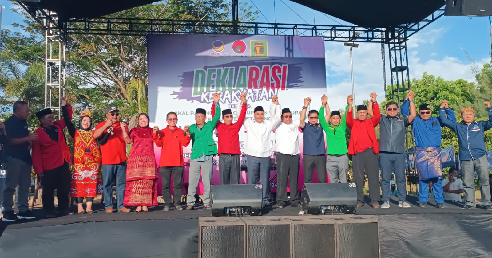 Suaraindo.id – Partai Demokrasi Indonesia Perjuangan (PDIP), Partai Nasdem dan Partai Persatuan Pembangunan (PPP) bersama Partai Demokrasi Indonesia Perjuangan (PDIP) mendeklarasikan pasangan calon Bupati Junaidi dan calon Wakil Bupati Suprapto maju di Pilkada 2024, Kamis, (29/8/2024) sore di lapangan Tanjung Pura Ketapang.