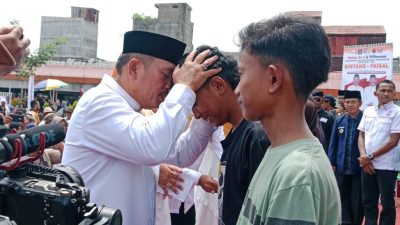 Saat menyerahkan santunan kepada anak yatim terlihat H.Affan Alfian Bintang lmeneteskan air mata saat memeluk dan mencium kening para anak yatim yang menerima santunan.