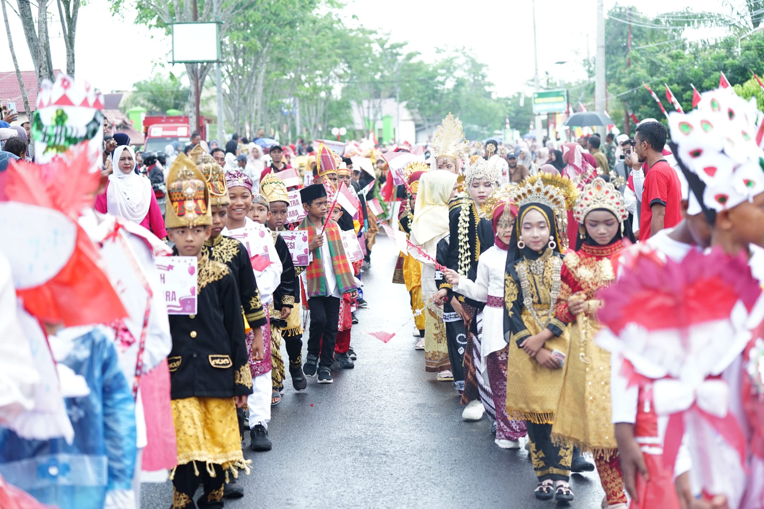 Ribuan masyarakat yang berbaris sepanjang jalan, ikut menyaksikan barisan pelajar yang mengenakan beragam kostum menarik. Mulai dari pakaian adat Nusantara yang kaya akan warna dan detail, hingga seragam profesi seperti TNI, Polri, dokter, pilot, perawat, pemadam kebakaran, guru, petani, nelayan, dan masih banyak lagi.