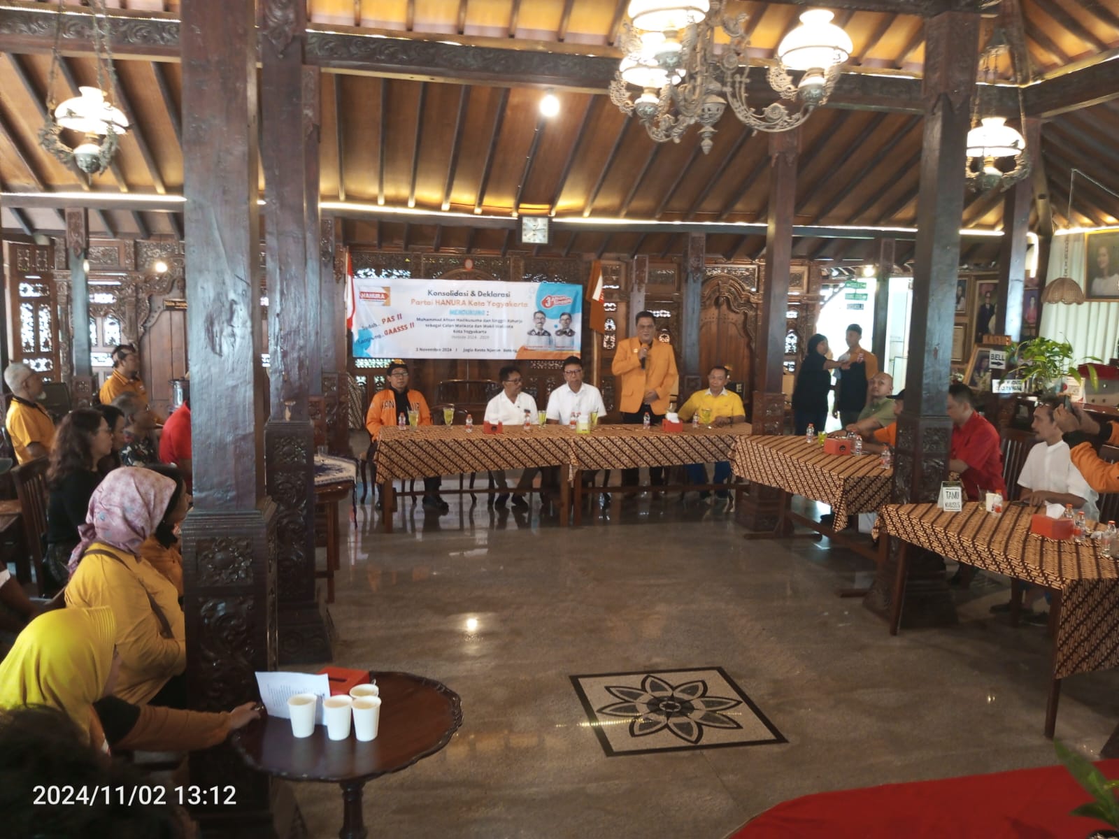 Suaraindo.id – Pengurus dan kader Partai Hati Nurani Rakyat (Hanura) Kota Yogyakarta, resmi memberikan dukungannya ke pasangan calon walikota dan wakil walikota, Muhammad Afnan Hadikusumo dan Singgih Raharjo. Hal itu disampaikan Ketua DPC Partai Hanura, Eddy Zarkasi, SE., saat deklarasi dan konsolidasi, Sabtu (2/11/2024).