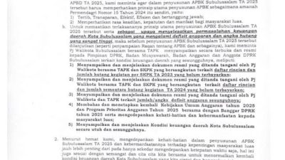 Surat tersebut, Fraksi Rabbani yang di Ketuai oleh Ratmala Dewi Hasugian Anggota DPRK 2024-2029 itu memberikan beberapa masukan dan saran kepada Pimpinan untuk disampaikan kepada Pj wali kota bersama TAPK.
