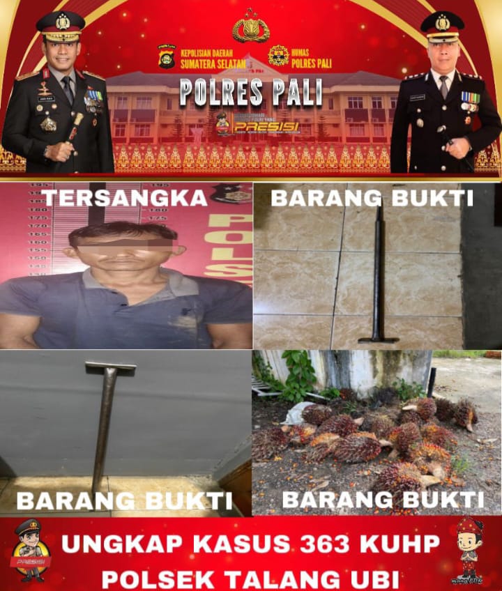 “Setelah menerima laporan,kami langsung bergerak menuju lokasi kejadian, Tersangka MR berhasil kami amankan di tempat, sementara tiga pelaku lainnya yang berinisial SY, AR, dan RG berhasil melarikan diri bersama satu unit mobil Carry berisi 32 tandan buah sawit hasil curian,” ungkap Panit I Reskrim Polsek Talang Ubi, Ipda Jan Harianto Sihombing, S.H., M.H.