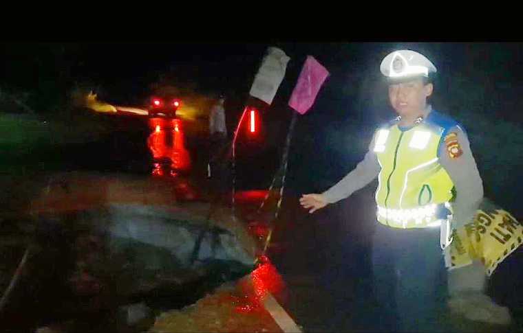 “Dari pantauan di lapangan, setengah badan jalan mengalami longsor. Kami mengimbau kepada para pengguna jalan untuk lebih berhati-hati karena kondisi penerangan di lokasi minim,” ujarnya.