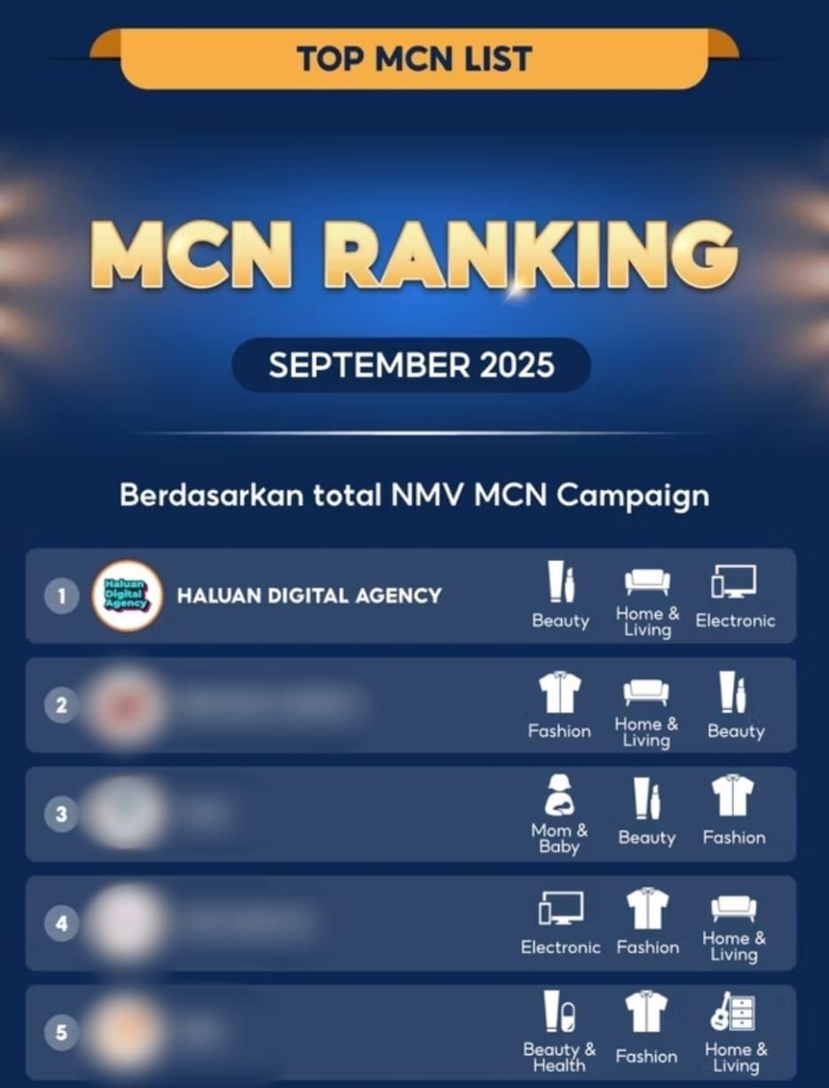 Hasil peringkat resmi Shopee menunjukkan Haluan Digital Agency berhasil mengungguli sejumlah MCN lama yang sebelumnya mendominasi pasar live commerce dan affiliate di Indonesia.