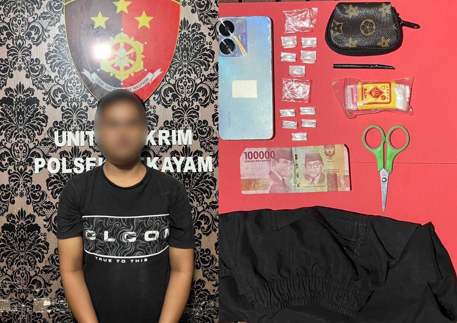 Selain barang bukti sabu, petugas juga menyita sejumlah peralatan yang diduga digunakan untuk transaksi dan konsumsi narkotika, di antaranya satu dompet kecil warna hijau berisi bundelan plastik kosong, dua sendok takar dari sedotan, sebuah gunting kecil, handphone Realme C55 warna Sunshower, serta uang tunai Rp100.000 yang diduga hasil penjualan narkoba.