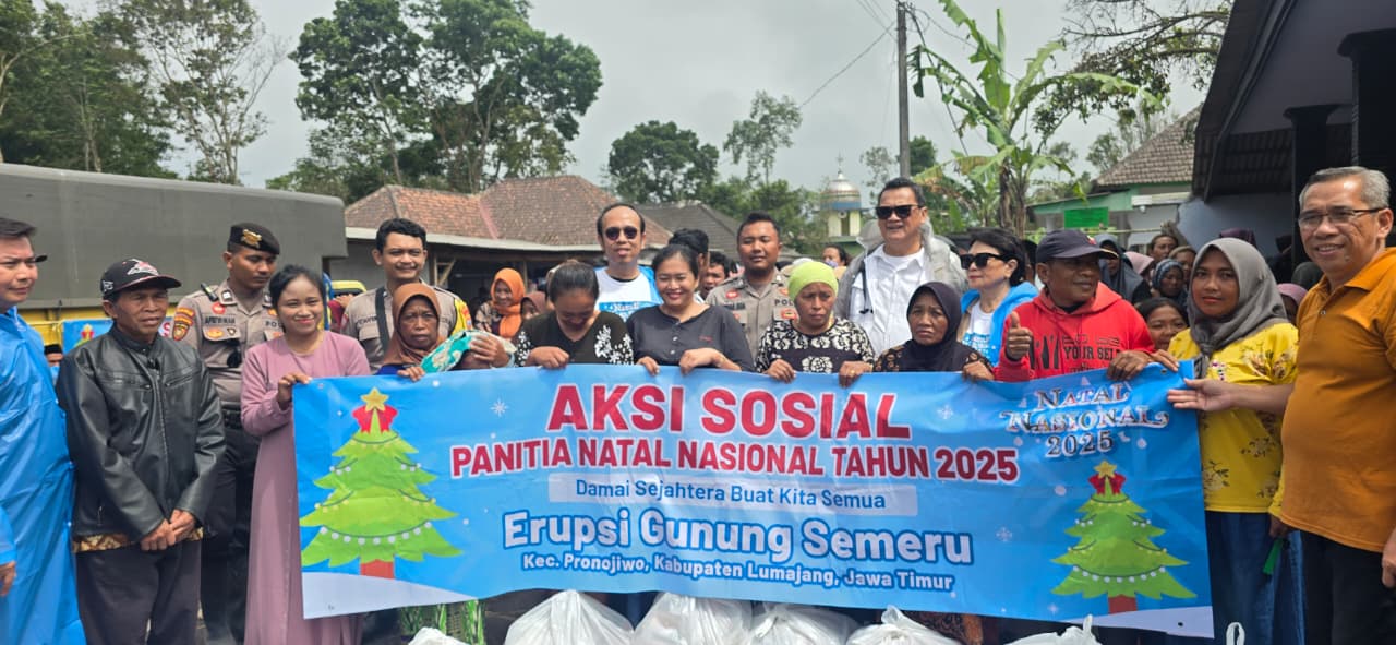 suaraindo.id — Panitia Natal Nasional 2025 menggelar aksi sosial peduli bencana untuk warga masyarakat yang terdampak erupsi Gunung Semeru di wilayah Kabupaten Lumajang, Jawa Timur, Jumat (27/11/2025). Sebanyak 1.000 paket sembako dibagikan langsung kepada warga yang bermukim di sekitar kawasan terdampak erupsi.