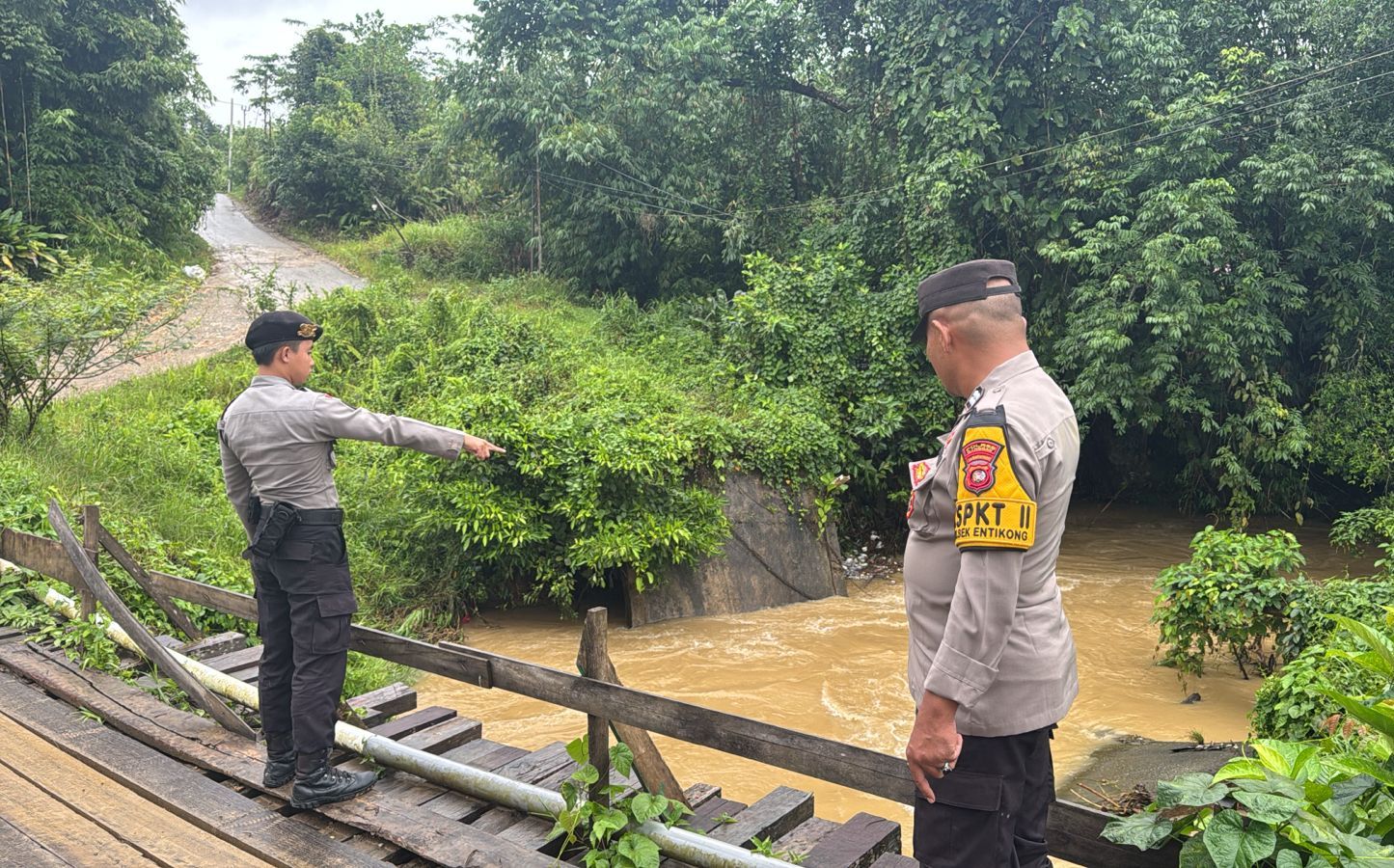 Patroli dipimpin Aiptu Sugeng T.P bersama Bripda Fletesen Viktorius Zeno dan Bripda Adhy Ferdinan. Mereka menyisir sejumlah titik rawan banjir, kawasan potensi angin kencang, hingga lokasi rawan longsor yang berada di beberapa wilayah Kecamatan Entikong.