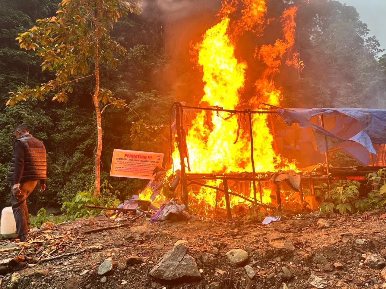 Selain itu, tim juga memasang police line dan spanduk larangan sebagai penegasan bahwa kawasan tersebut tidak boleh lagi digunakan untuk aktivitas penambangan ilegal.