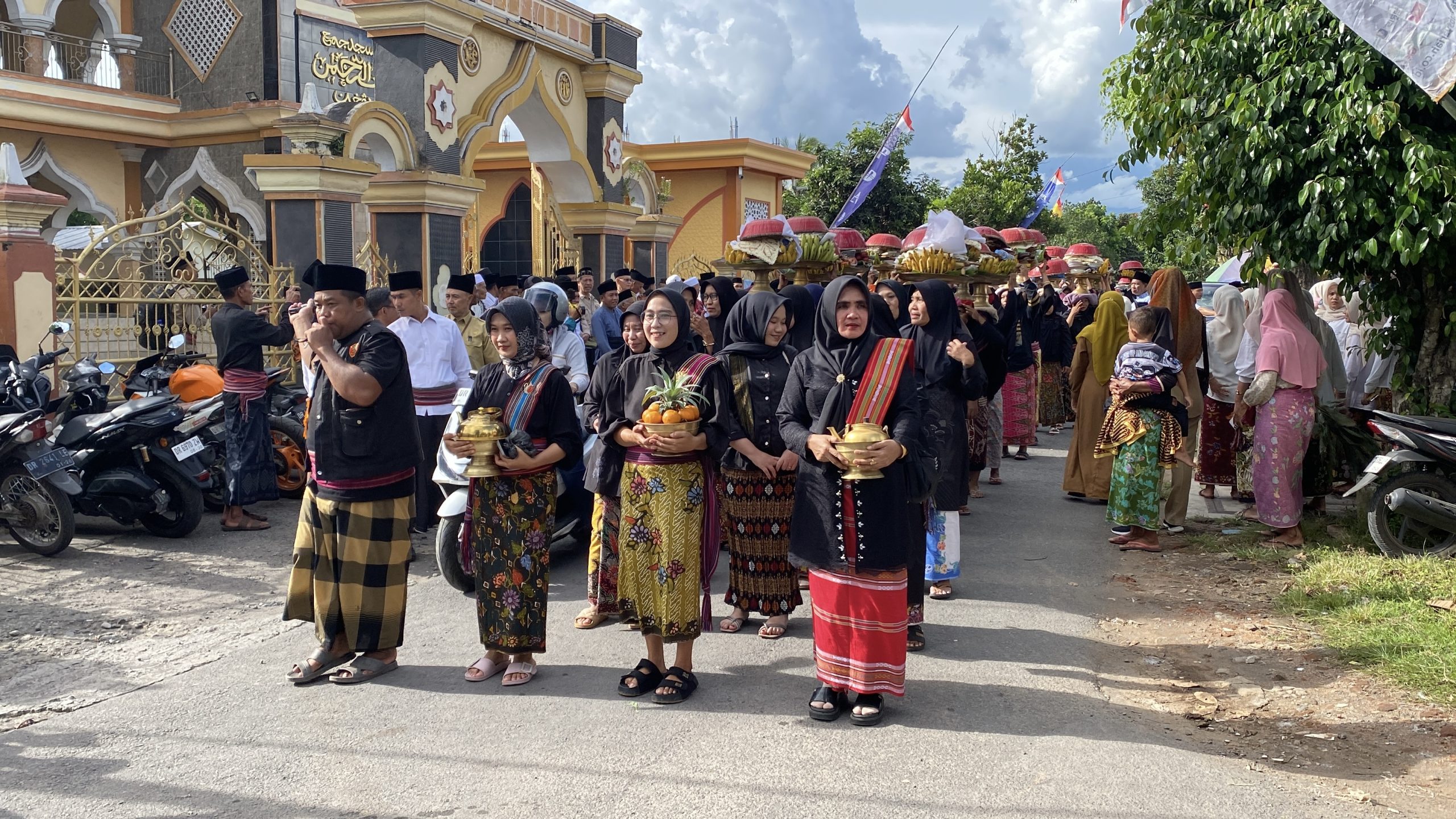 Ratusan warga berbaris membawa baki tradisional khas Sasak yang disebut tembolaq beak.