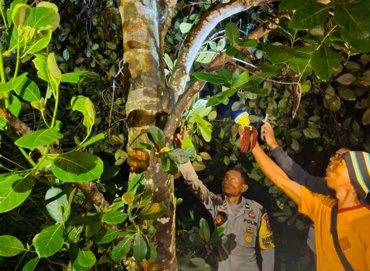 Di lokasi, salah seorang warga memanjat pohon nangka dan melepaskan jeratan jaring keramba yang menjerat leher korban, sementara warga lainnya bersiaga di bawah untuk menahan tubuh korban saat diturunkan.