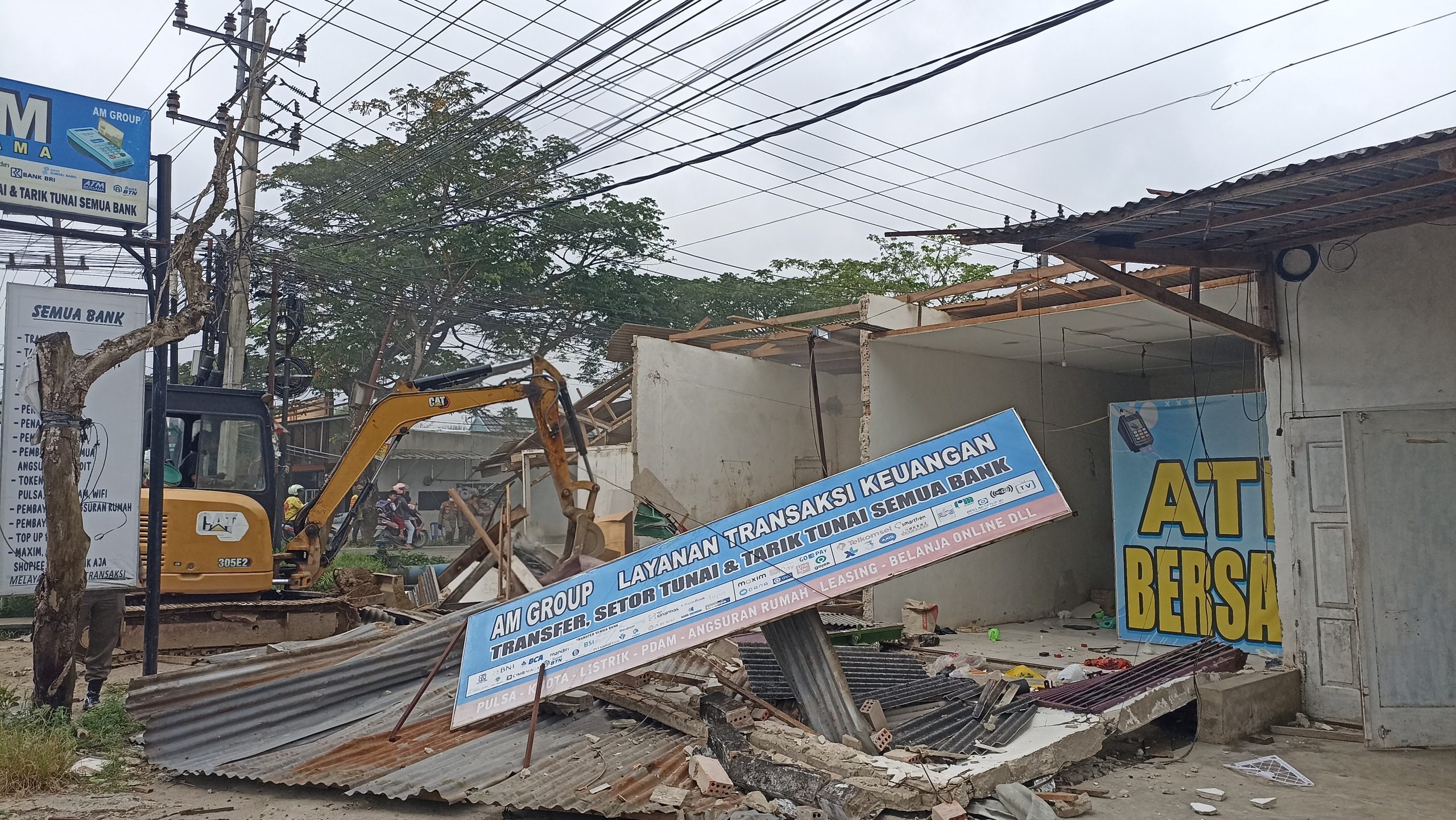 Bangunan berupa kios tersebut dibongkar karena berdiri di atas jalur hijau dan dinilai melanggar ketentuan tata ruang.